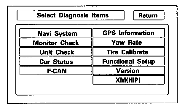 Use the navigation display hard buttons, press and hold the 3 buttons (Menu, Map/Guide, and Cancel), and keep them pressed for about 5 seconds. The display screen will go directly to the "Select Diagnosis Items" menu.