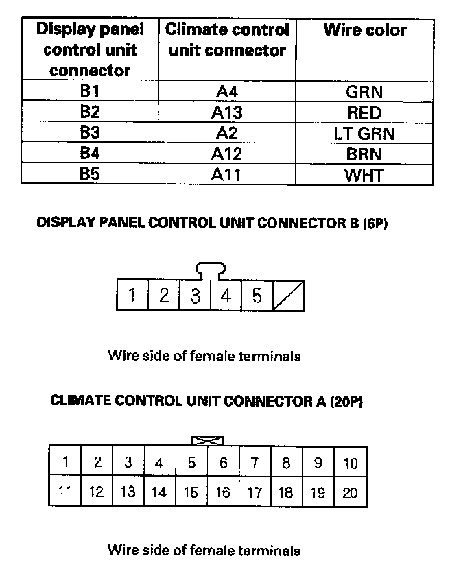 9. Check for continuity between display panel control unit connector B (5P) and climate control unit connector A (20P) according to the table.