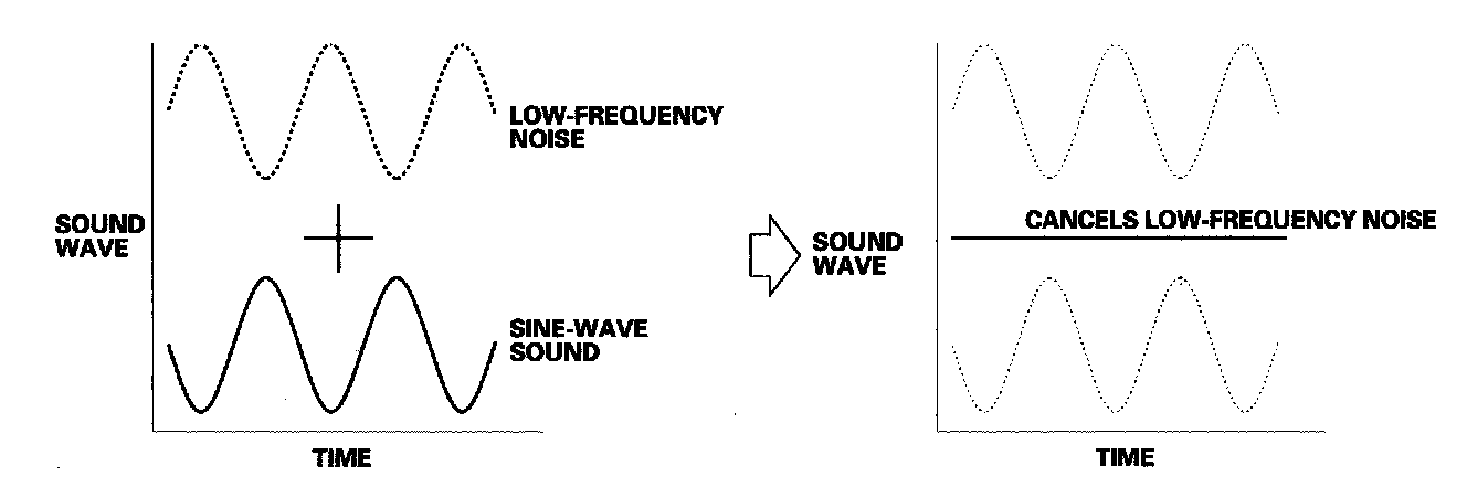 The system includes an active noise control system to cancel some of the vehicle noise. It uses a sine-wave-sound output to cancel low frequency noise. Two microphones detect the low frequency sound, and the system outputs a canceling sound through the audio speakers.