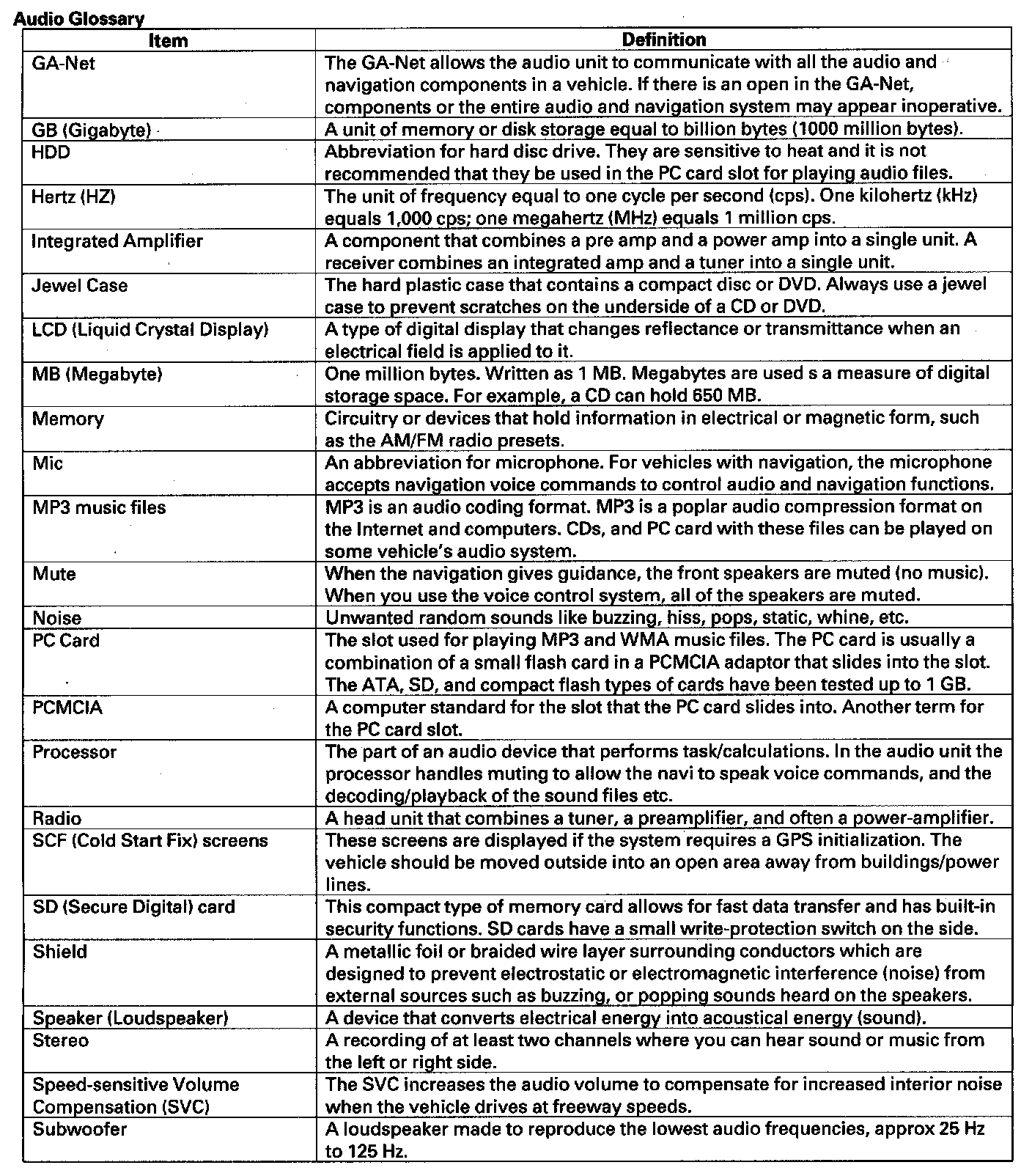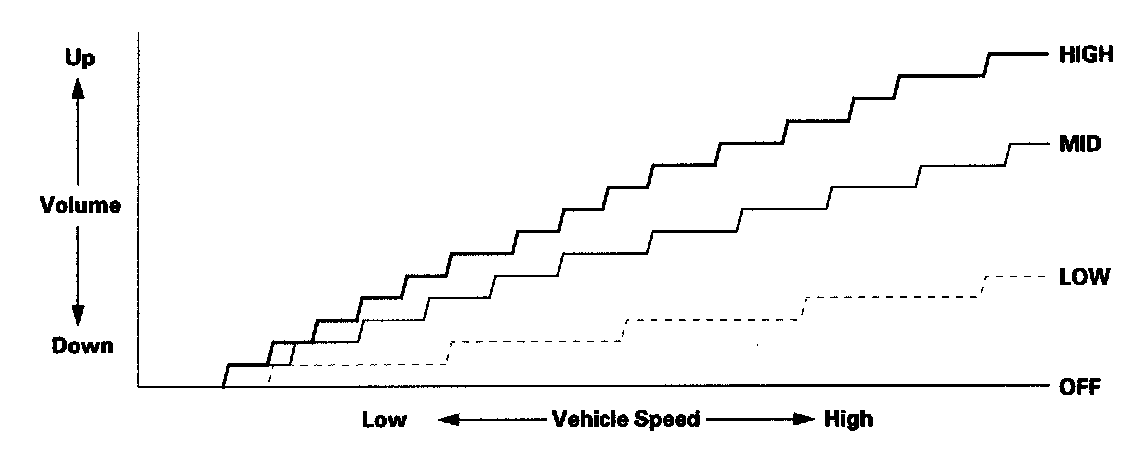 The audio systems are equipped with speed-sensitive volume compensation (SVC). The audio unit receives the vehicle speed pulse (VSP) from the ECM/PCM. The system processes the speed input and increases the audio system volume level as the vehicle speed increases to compensate for the various interior noises that occur at higher speeds. When the vehicle slows down, the volume returns to its normal level. The SVC has four settings: SVC OFF, LOW, MID and HIGH that can be adjusted using the audio unit. The SVC comes from the factory with MID set as the default (See the Owner's Manual for more information).