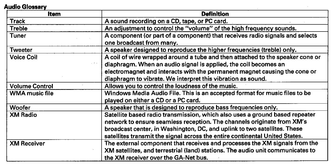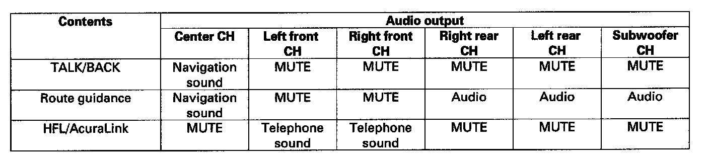 The navigation system provides voice control for front/rear audio, XM, and CD player. Voice control commands are communicated on the GA-Net (audio unit). When using the TALK/BACK or route guidance (RG), only the center speaker gives the navigation instructions. When using HFL/AcuraLink, the center speaker, the rear speakers, and the subwoofer are muted and the front left/right speakers give the telephone sound. When using HFL/AcuraLink and RG or TALK/BACK, the rear speakers, and the subwoofer are muted and the front speakers give the telephone sound and the navigation instructions. Muting commands are passed on the GA-Net bus. For more information, see the navigation section. The outline of the audio interruption function is shown in the following table.