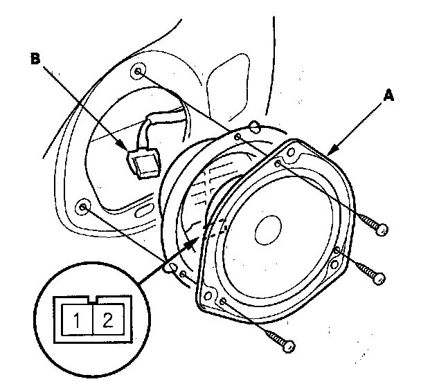 3. Disconnect the 2P connector (B), and remove the front door speaker.