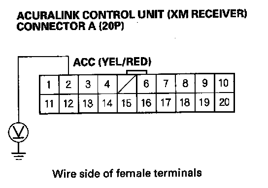 3. Measure the voltage between the No. 2 terminal of the AcuraLink control unit (XM receiver) connector A (20P) and body ground.