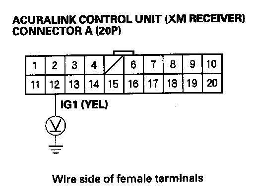 4. Measure the voltage between the No. 12 terminal of the AcuraLink control unit (XM receiver) connector A (20P) and body ground.