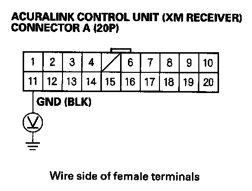 5. Measure the voltage between the No. 11 terminal of the AcuraLink control unit (XM receiver) connector A (20P) and body ground.