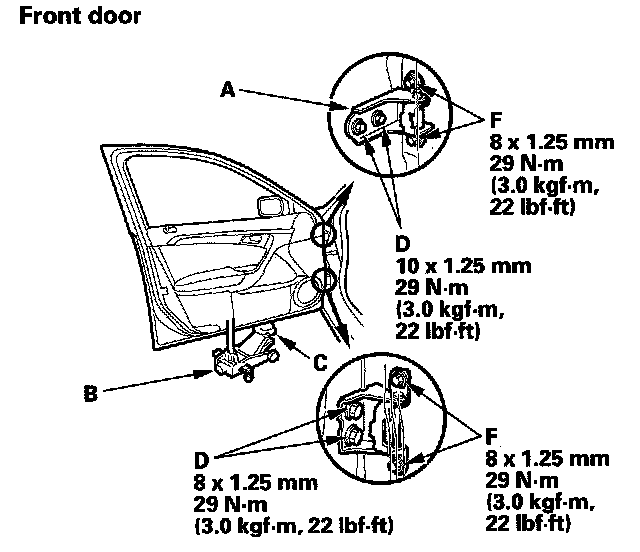 3. If necessary, replace the door mounting bolts with the adjusting bolts (PIN 90102-SFA-305) made specifically for door adjustment, then adjust at the door: Loosen the door mounting bolts (F) slightly, and move the door up or down as necessary to equalize the gaps, and in or out until it's flush with the body.