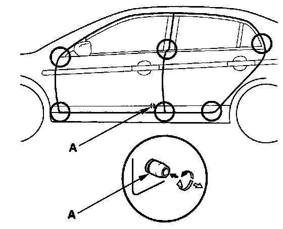 4. Make sure that the door and body edges are parallel. If necessary, adjust the door cushion (A) to make the rear of the doors flush with the body.