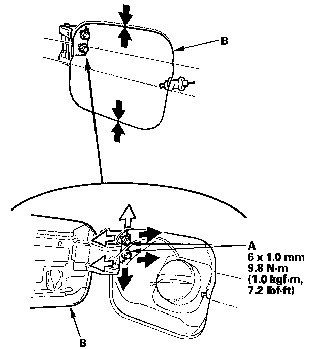 2. Adjust the fuel fill door (B) in or out until it's flush with the body, and up or down as necessary to equalize the gaps.