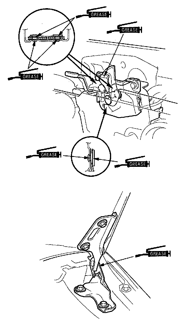 8. Apply multipurpose grease to the hood latch and hood hinge as indicated by the arrows.
