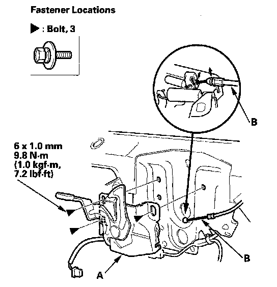 4. Remove the bolts, then remove the hood latch (A) from the body.