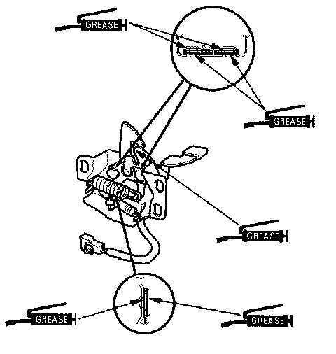 - Apply multipurpose grease to the hood latch as indicated by the arrows.