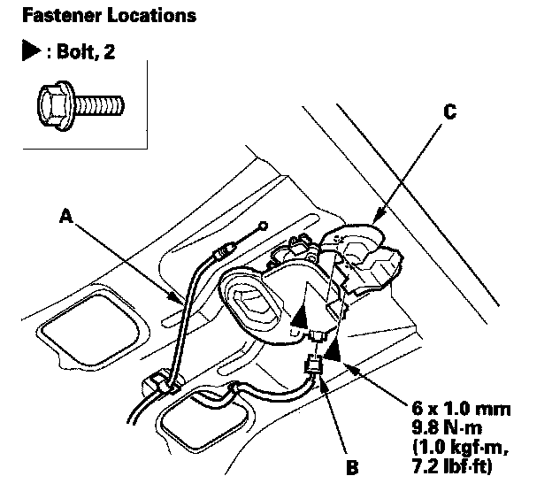 3. Remove the bolts from the trunk lid latch (C), then remove the latch.