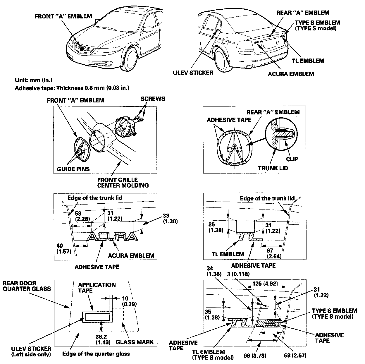 3. Apply the emblems/sticker where shown. When installing the ULEV sticker on the inside surface of the rear door quarter glass, align the sticker application tape with the edge of the glass mark as shown, then press the sticker into place, and remove the application tape.