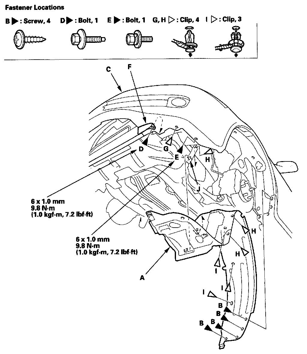 3. From the wheel arch, remove the clips (H, I) securing the front inner fender (and splash shield) to the body. A Release the hook (J) of the splash shield, then remove the front inner fender.