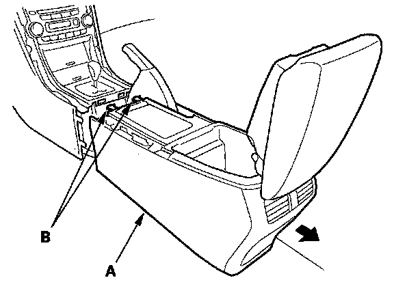 3. Slide the rear section of the center console (A) rearward to release the hooks (B).