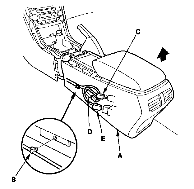 4. Lift up the rear of the console (A). Release the harness retainer clip (B) from the air duct, and disconnect the console accessory power socket connector (C), the light bulb socket connector (D), and the AUX connector (E), then remove the rear section of the center console.