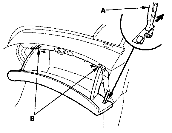 1. Detach the hook of the glove box damper (A), and remove the glove box stop (B) on each side from the dashboard by pushing them in.