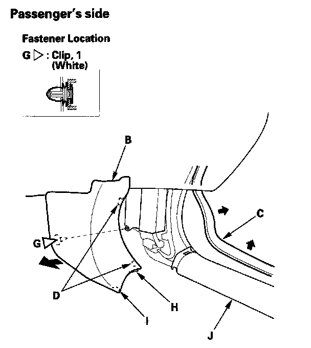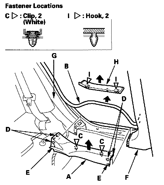 3. Pull the kick panel back by hand to detach the clips (F, G), and to release the hook (H) and tab (I) from the front door sill trim (J), then remove the panel.