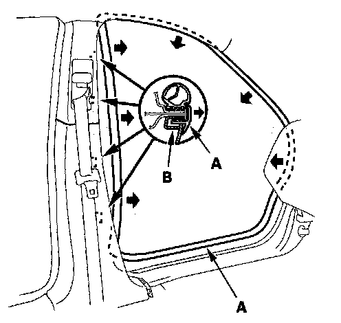 6. Pull out the rear door opening trim (A) from the trim hooks (B) and around the rear door opening flange, then remove the trim.