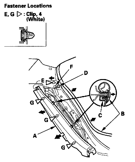 4. If necessary, pull the front side outer trim (F) up to detach the clips (G), then remove the trim.