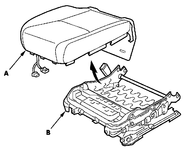 5. Remove the seat cushion cover/pad (A) from the seat frame (B).