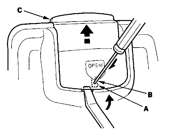 1. Using a trim tool, pry the rear seat handle (A) up at both hook portions (B) on the forward side of the trunk pass through cover (C). Then slide the handle half-way up.
