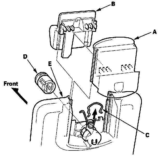 5. Remove the retainer clip (C), then remove the trunk pass-through cover key cylinder (D) from the cover (E).