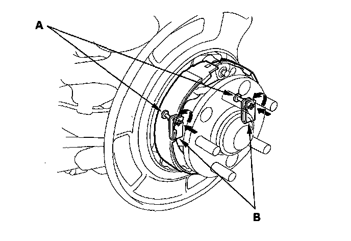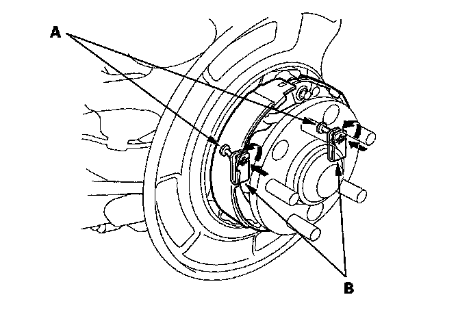 1. Apply Molykote 44MA grease to the sliding surface of the pivot pin (A), and insert the pin into the rearward brake shoe (B) from the outside.