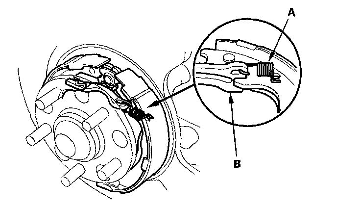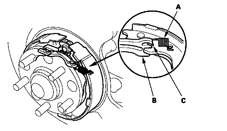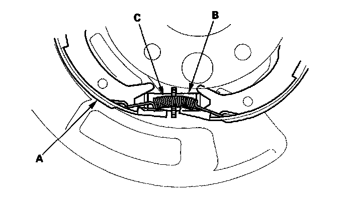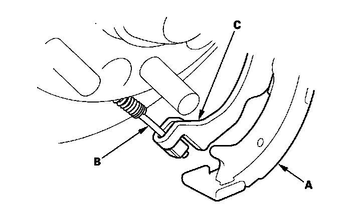 8. Remove the forward brake shoe (A) and the adjuster assembly (B) by removing the lower return spring (C).