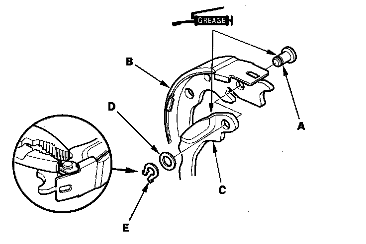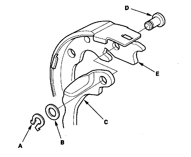 10. Remove the U-clip (A), wave washer (B), parking brake lever (C), and pivot pin (D) from the brake shoe (E).