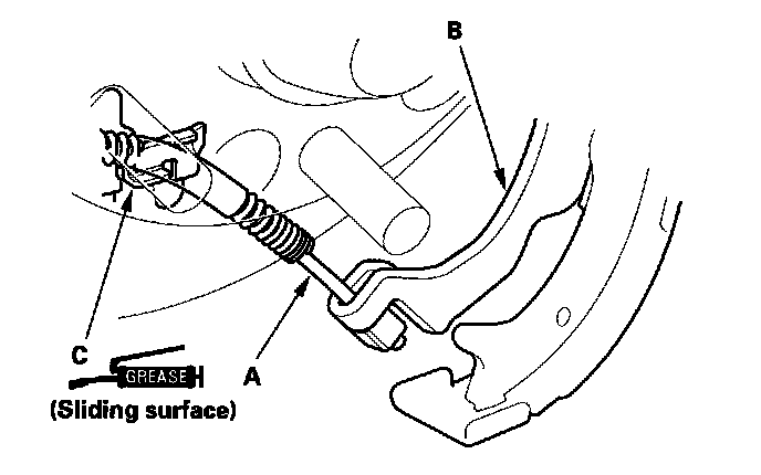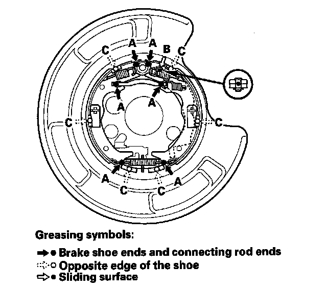 4. Apply a thin coat of Molykote 44MA grease to the shoe ends and connecting rod ends (A), sliding surfaces (B), and opposite edges of the parking brake shoe (C) as shown. Wipe off any excess. Keep grease off the brake linings.