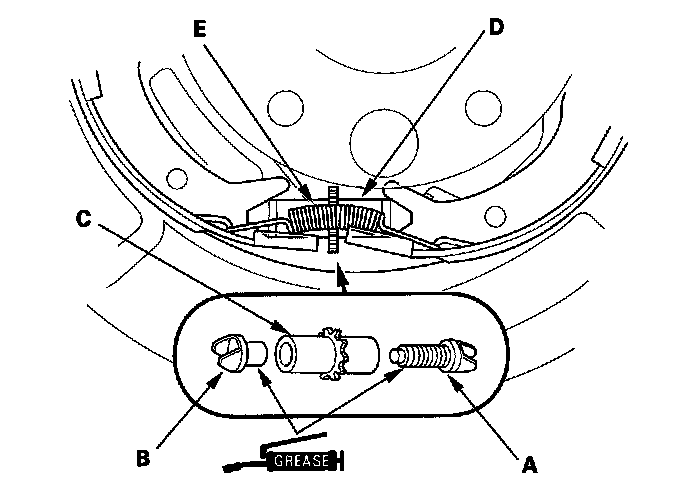 6. Install the brake shoe adjuster assembly (D) and hook the lower return spring (E) on the parking brake shoes.