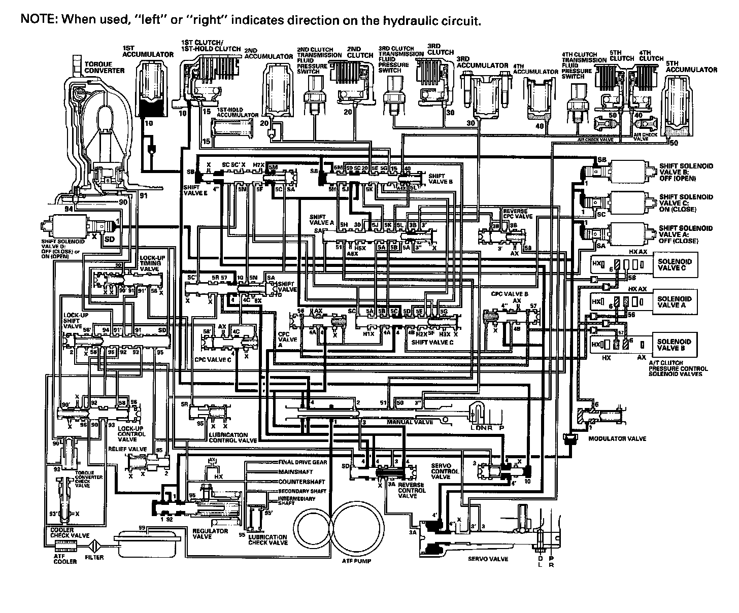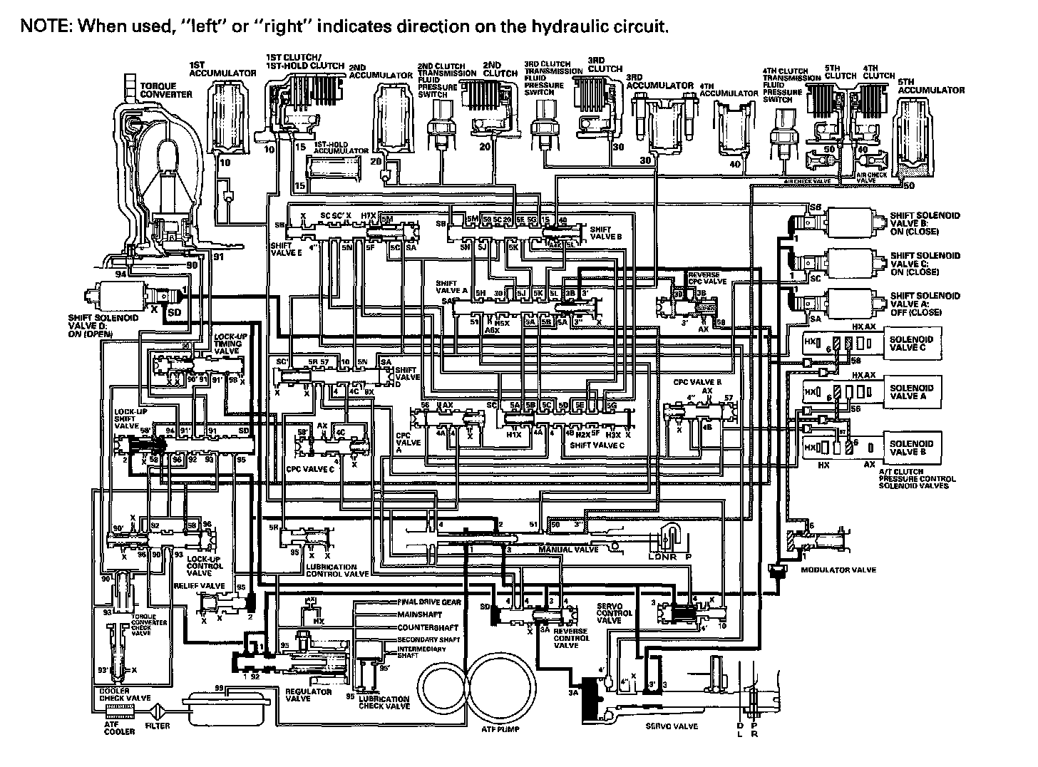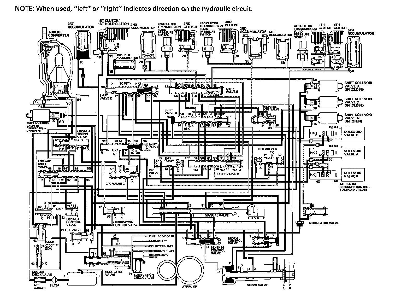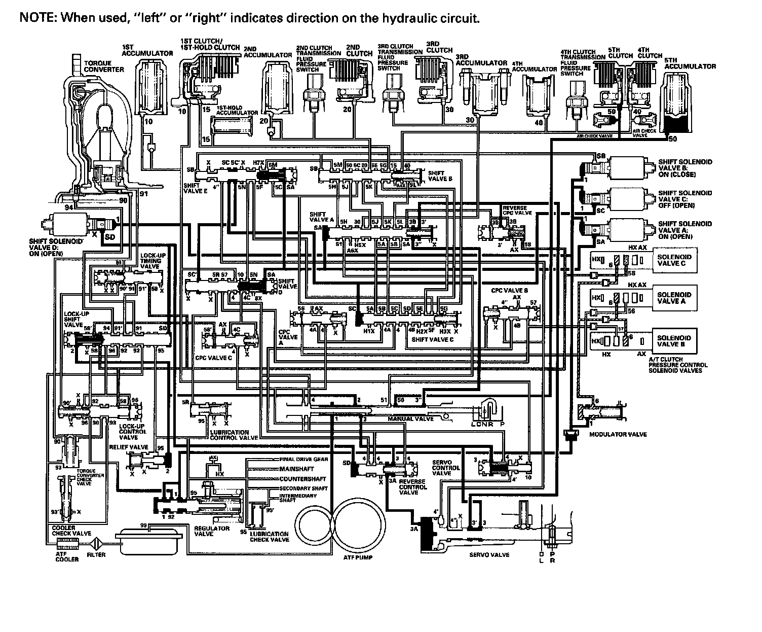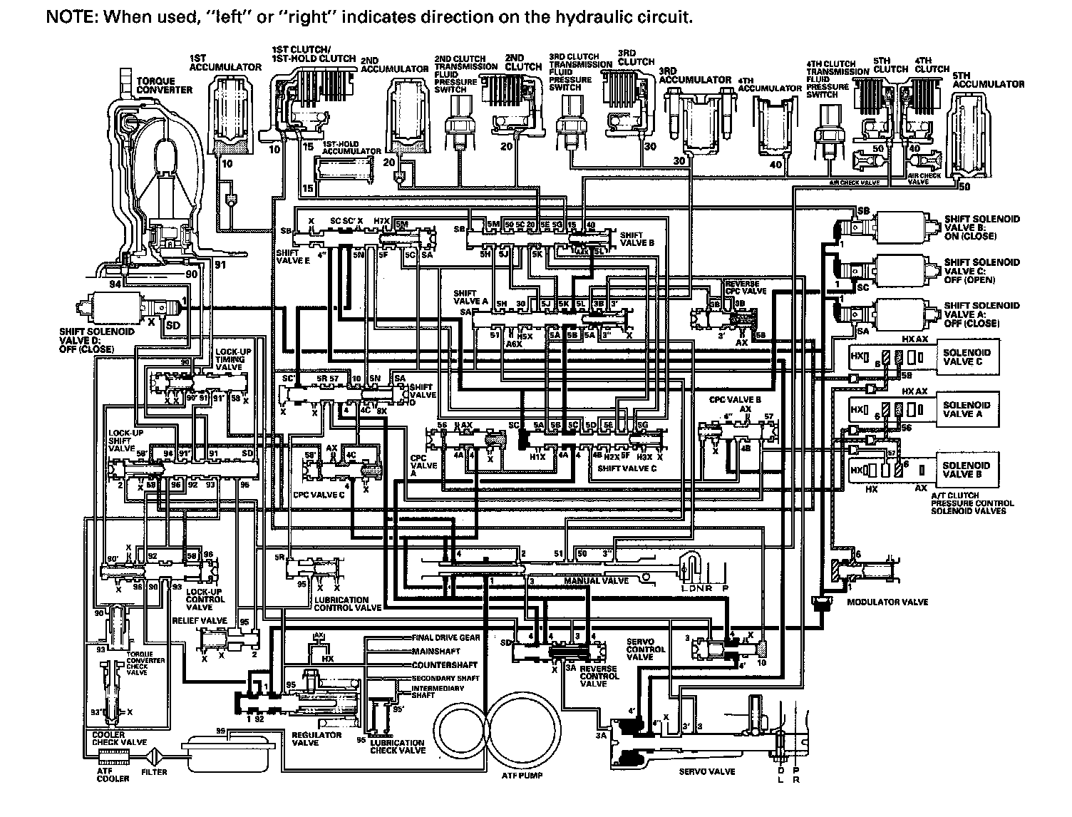As the speed of the vehicle reaches the programmed value, the PCM turns shift solenoid valve A ON, and shift solenoid valve A uncovers the port of shift solenoid valve A pressure (SA) to shift valve A. Shift valve A is moved to the right side to switch the port of line pressure (3') and reverse CPC pressure (3B) leading to the 5th clutch. Line pressure (3) flows to the manual valve via the servo valve and shift valve A, and becomes 5th clutch pressure (50) at the manual valve. The 5th clutch pressure (50) flows to the 5th clutch, and the 5th clutch is engaged with the line pressure mode.