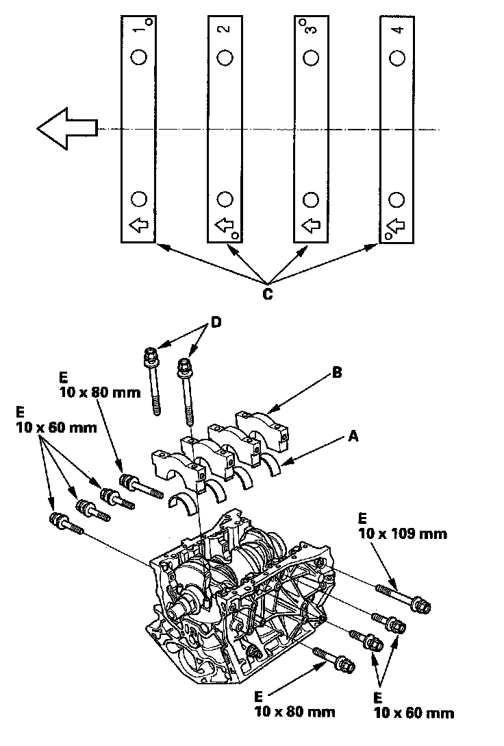 8. Apply new engine oil to the bolt threads and flanges, then loosely install the bearing cap bolts (D) and bearing cap side bolts (E).