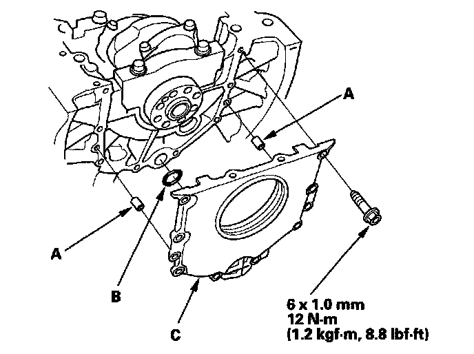 28. Install the dowel pins (A), new O-ring (B) and the engine block end cover (C) on the engine block.
