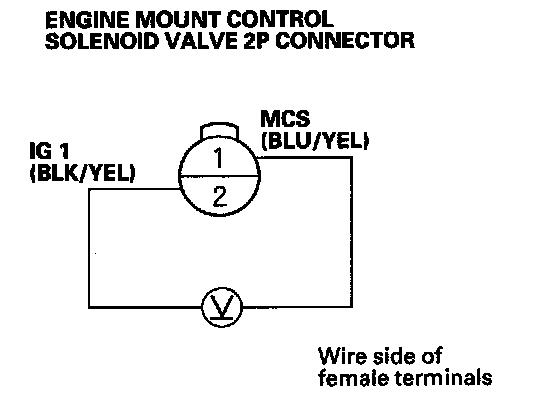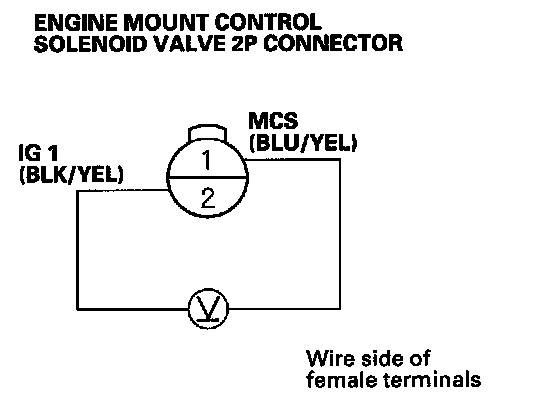 9. Measure the voltage between the engine mount control solenoid valve 2P connector terminals No. 1 and No. 2, with the engine at idle.