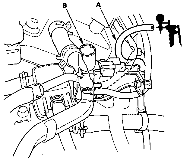 12. Disconnect the vacuum hose (A) that is connected to the solenoid connector from the engine mount control solenoid valve (B), and connect a vacuum pump/gauge, 0 - 30 in.Hg, to the hose. Apply about 20 in.Hg of vacuum, and wait for 20 seconds.