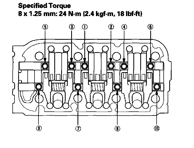9. Tighten each bolt two turns at a time in the sequence shown to ensure than the rockers do not bind on the valves.