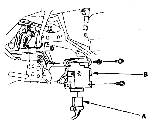 6. Disconnect the 10P connector (A) from the passenger's mode control motor (B). Remove the self-tapping screws and the passenger's mode control motor from the heater unit.