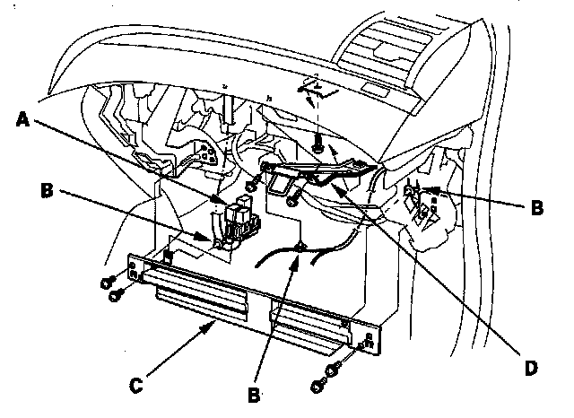 2. Remove the relays (A) and the wire harness clips (B), then remove the bolts and the glove box frame (C). Remove the self tapping screws, and the glove box striker (D).