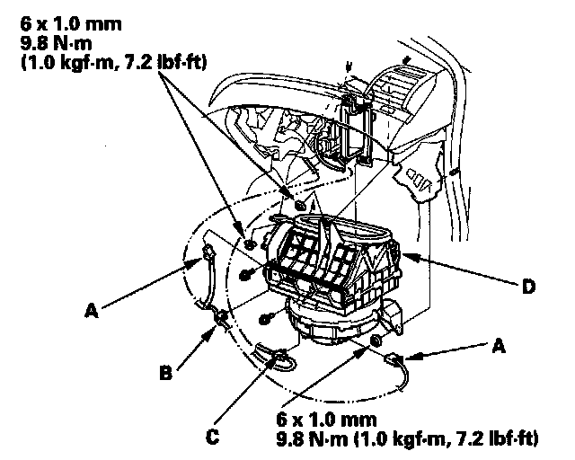 3. Disconnect the connectors (A) from the blower motor, and the recirculation control motor, then remove the wire harness clip (B) and the connector clip (C). Remove the mounting nuts, the mounting bolts and the blower unit (D).