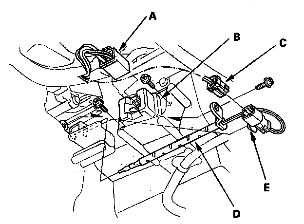 2. Disconnect the 4P connector (A) from the power transistor (B) then remove the self-tapping screws and carefully pull out the power transistor. Disconnect the 2P connector (C) from the evaporator temperature sensor (D), then remove the connector clip (E). Remove the self-tapping screw, and carefully pull out the evaporator temperature.