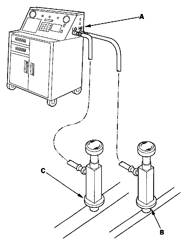 1. Connect an R-134a refrigerant recovery/recycling/charging station (A) to the high-pressure service port (B) and the low-pressure service port (C), as shown, following the equipment manufacturer's instructions.