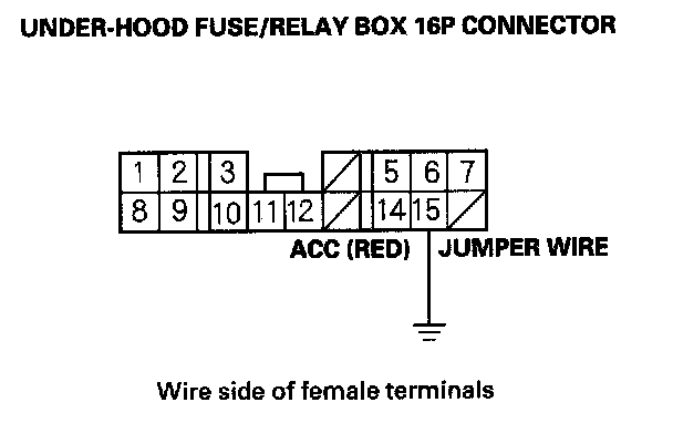 9. Momentarily connect under-hood fuse/relay box 16P connector terminal No. 15 to body ground with a jumper wire several times.