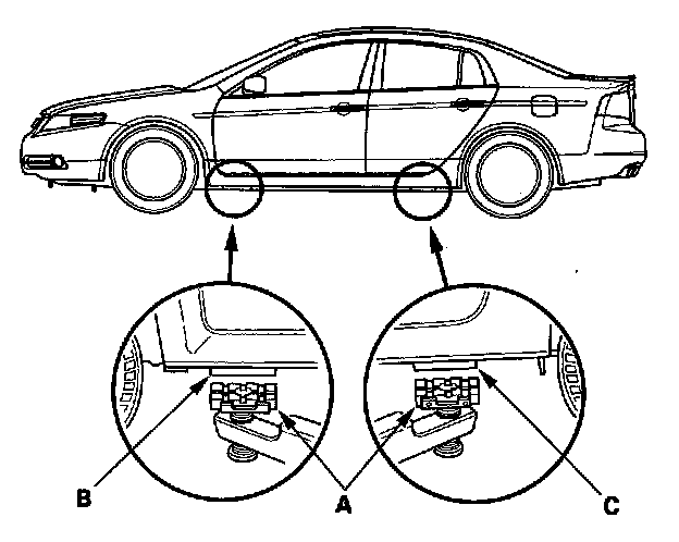 1. Position the lift blocks (A) under the vehicle's front support points (B) and rear support points (C).