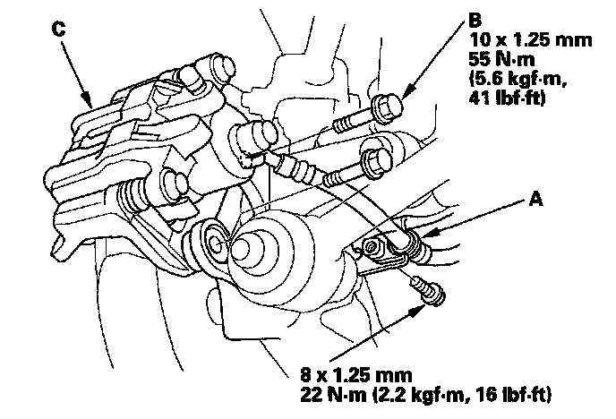 4. Remove the brake caliper bracket mounting bolts (B), then remove the caliper assembly (C) from the knuckle. To prevent damage to the caliper assembly or brake hose, use a short piece of wire to hang the caliper assembly from the undercarriage. Do not twist the brake hose excessively.