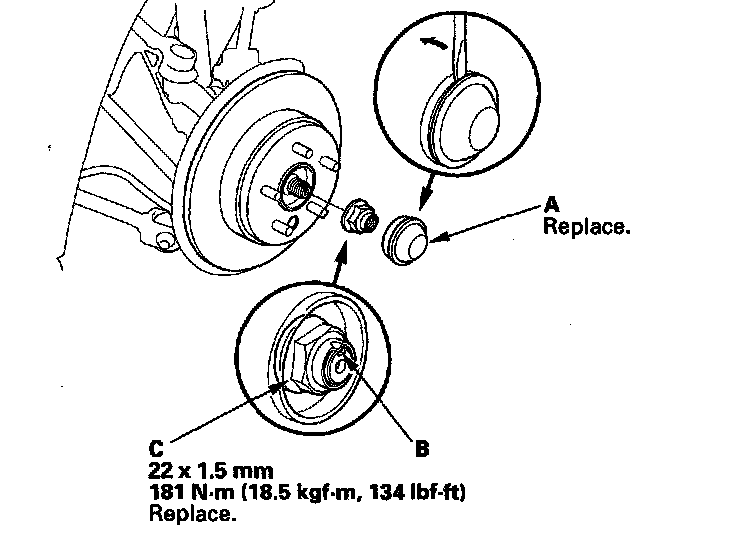 ^ Before installing the spindle nut, apply a small amount of engine oil to the seating surface of the nut. After tightening, use a drift to stake the spindle nut shoulder against the driveshaft.
