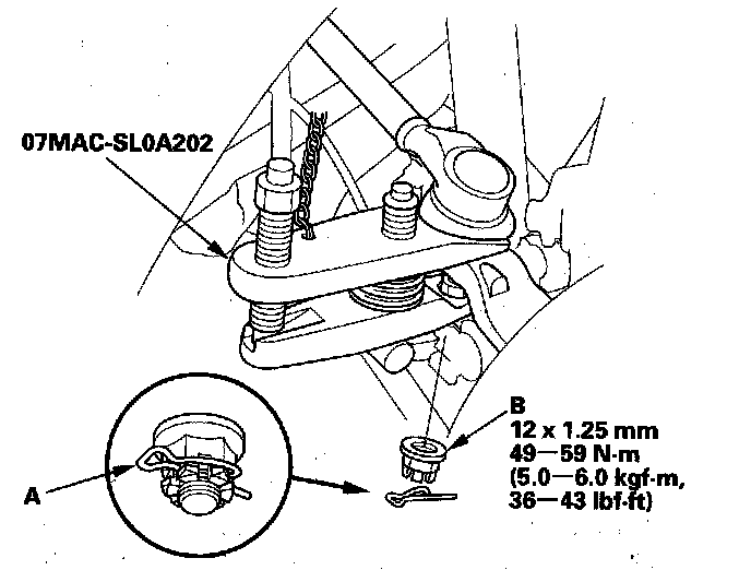 3. Remove the lock pin (A) from the upper arm ball joint, then remove the castle nut (B).