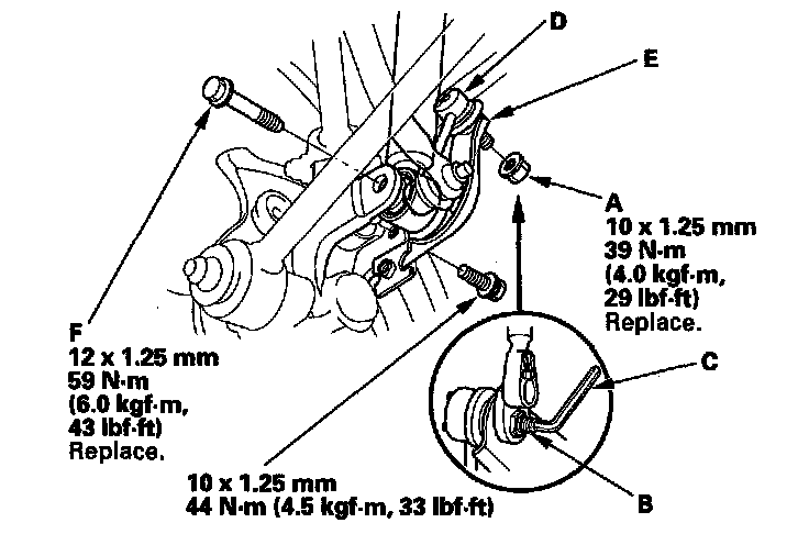 6. Remove the damper lower mounting bolt (F), and disconnect the damper from the knuckle.