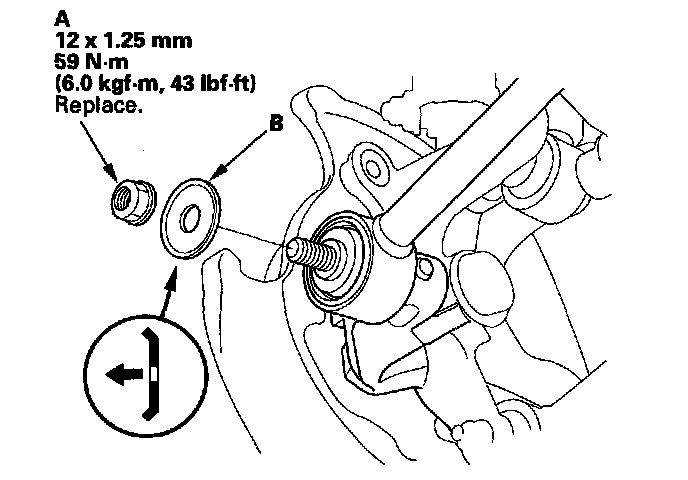 8. Remove the self-locking nut (A) and washer (B) from the knuckle.